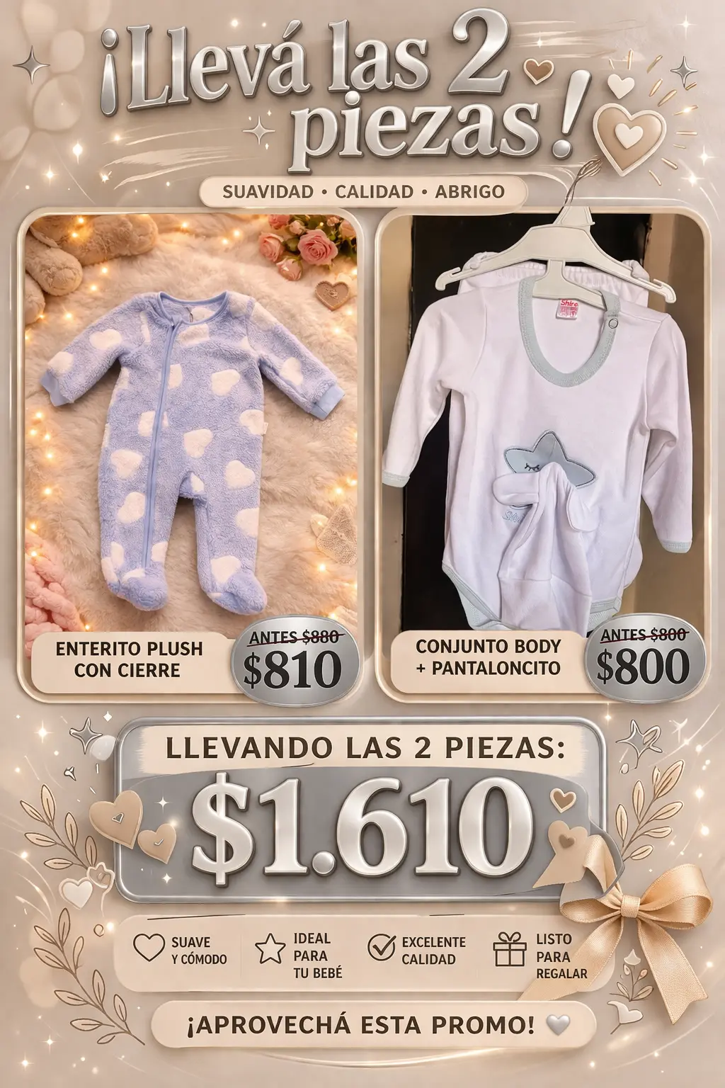 Enterito peluche abrigado + conjunto en algodón de body pelele y gorrita ideal para el frío talle de 0 a 3 meces